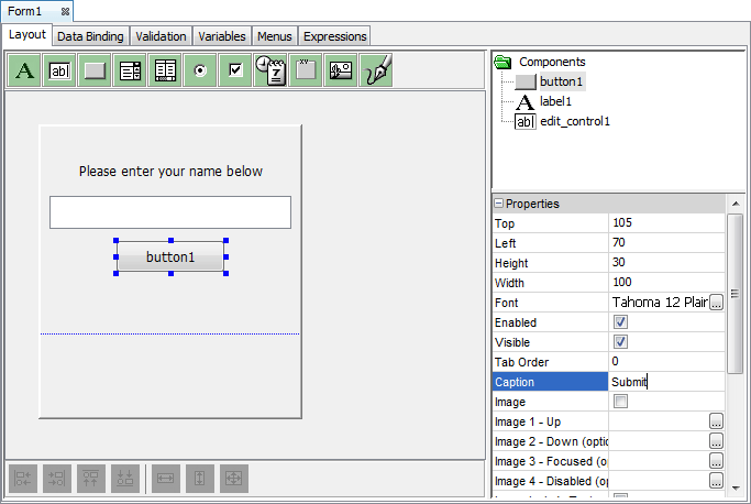 Similarly, click on the Button control added, and change the caption to "Submit"be reflected within the form layout.