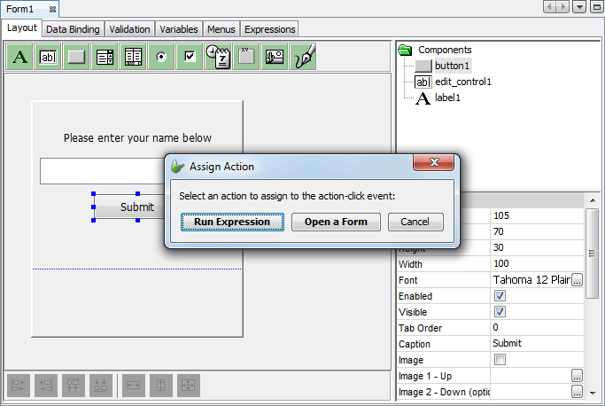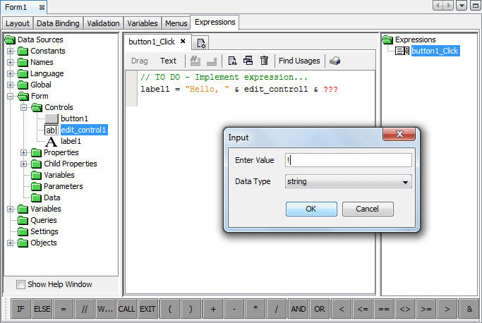 Alternatively, controls without expressions may be double clicked to automatically create an expression. This will create a new expression, and open it in the form's Expression Editor tab. Other expressions of the form may also be reviewed and edited through this tab. If a control with an existing action is double clicked, its associated expression be opened.