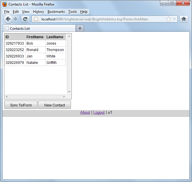 The application included in this tutorial runs on a Windows Mobile or Android device. It will display a list of contacts which may be selected and then edited on double click, or have new records registered via the "New Contact" button, both operations performed via the 'Edit Contact' cursor form. Once these details are modified locally, the records are synchronised to the server, and then the most up to date set of records is retrieved. This is done via the "Sync To/From" button. Verify this behaviour by opening or deploying the companion BEP, entering the server details in BrightForms, and performing the operations.