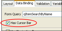 Cursor forms are a feature of BrightBuilder which enables developers to create applications which access, create, modify and delete data within a particular subset of records with ease. A form may be defined as a cursor form by selecting the ‘Has Cursor Bar’ checkbox in the ‘Data Binding’ tab. This may be set after assigning a query to the form (which defines the subset of data the form will access).