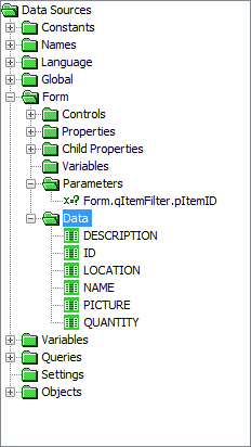 The data source tree will now also contain values in the Form > Data folder matching the assigned query’s output fields.