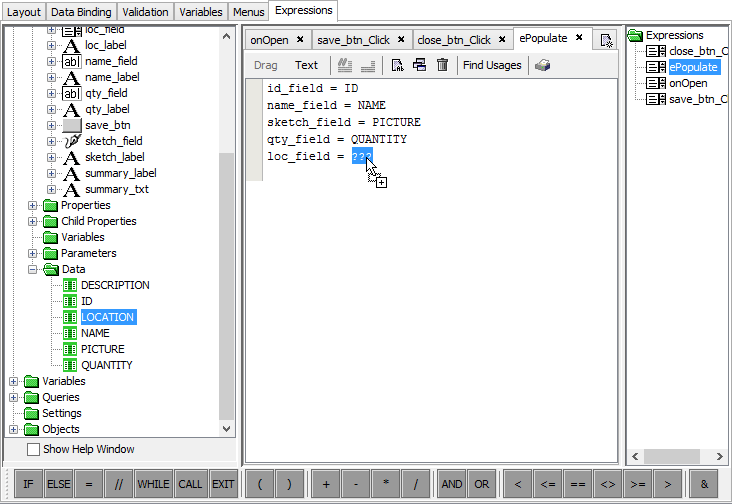 Complete the onLoad expression, which constructs a local summary string for the item, provided the values of the NAME, QTY and LOCATION fields are not equal to NULL. Have this string load into the summary_field control.