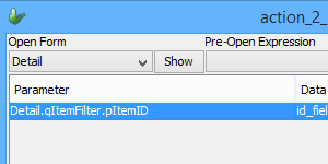 Also note that if the query contains a parameterised condition, this parameter should also be accessible via the Form > Parameters folder in the tree. Furthermore, if the form to which the query is bound to is a child form opening from a parent form’s control, the parameter should also appear in the ‘Action-Click’ dialog the respective control. This parameter should be assigned a value to load when the child opens.