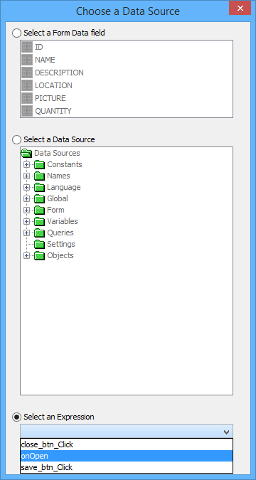 More complex load operations may also be modularised as expressions may also be linked as a source to load from. In this case, the form will run this expression instead of mapping the data source, and this expression will run when the form opens. To select an expression, click on the […] button, and select the ‘Select an Expression’ radio button, then choose one of the form’s expressions.