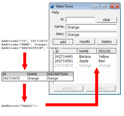 Records may be added to tables using both the AddColumn() and AddRecord() methods. Using these methods creates a temporary record which is then added to the table specified by AddRecord().