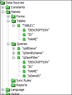 These methods usually take in values of table names, columns, queries and parameters in String format, which can either be entered in manually, or conveniently found under the Names folder of the data source tree.