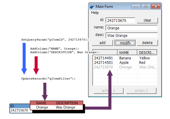 Modifying records in a database requires a query to specify what records need to be modified. It uses the SetQueryParam() method to set the parameter (if necessary) and UpdateRecords() with the query name in order to do this. Any modify expression with an invalid parameter or one which is not specified will not update when UpdateRecords() is called.