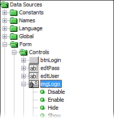 Controls which may be assigned or whose values may be retrieved are located in the Form > Controls folder of the data source tree. Whether or not a value is to be assigned or retrieved is based on where it is dragged and dropped to in the expression window.