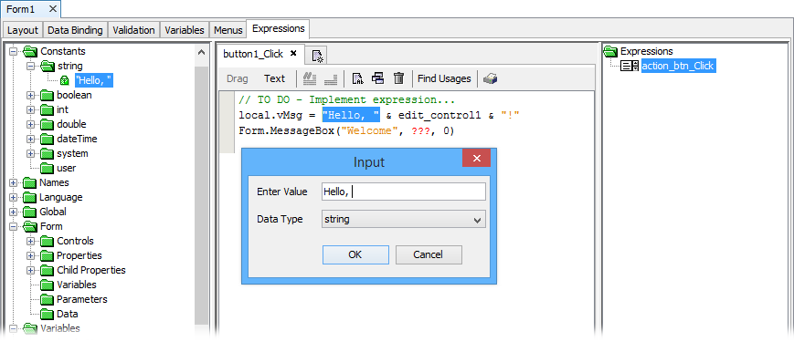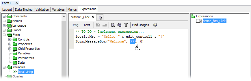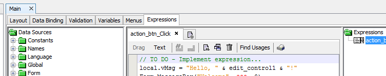 Alternatively, there are shortcuts to create and link expressions such as double clicking a control with an action property, which automatically creates an expression and links it to the default action of the control.