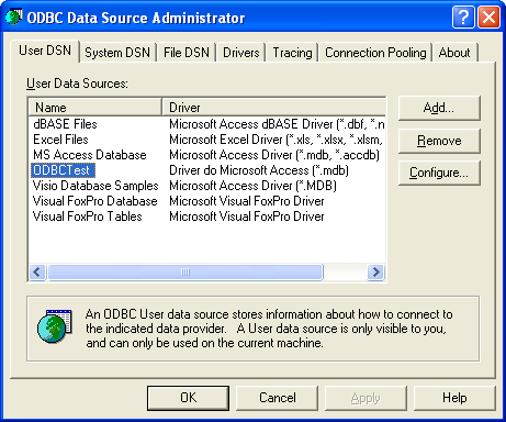 This will bring up the "ODBC Data Source Administrator" dialog, listing various data sources on the system.