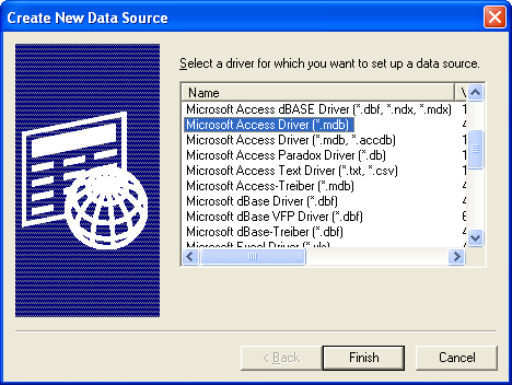 From this dialog, create a new user data source with the ‘Add…’ button. Choose the Microsoft Access Driver (*.mdb) as the type when prompted by the "Create New Data Source" dialog.