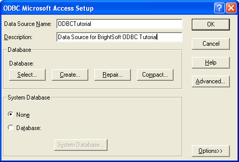 Under the database groupbox, click the Select button to choose an existing .mdb file. Select ODBCTutorial.mdb from the path you saved it to.