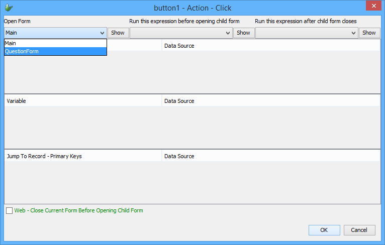 The child form may then be set using the Open Form dropbox, which lists all forms of the project. If parameterised queries are linked in the child form via listviews, combo boxes and/or data binding, the parameters of these queries may be assigned a data source under the Parameter section. Similarly, child forms will also have their variables listed in the Variable section.