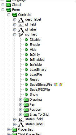 Scribbles are also similar to other controls, as they have a number of methods associated with it under the Form > Controls > [scribble name] folder of the data source tree. However, they also contain unique methods such as IsDirty(), which determines if the scribble has had any user input assigned to it, and Reset() which will clear any captured data.