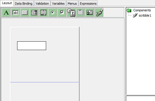 A user’s signature can be captured via the form control known as a Scribble. This scribble control captures the input of a stylus over its bounds, and is represented by default as a white, bordered box when dragged and dropped onto the form from the Controls toolbar.