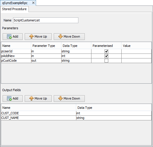 A valid RPC script must have the function executeRPC() to run correctly, a template of which is available when creating a new script via the context menu. This executeRPC method will be called by the application, and have input and output parameter values passed to it via arrays. A function name will also be specified. After processing, the script function will return a ResultRPC object, which will consist of output fields and a record set. An example of this is as follows: