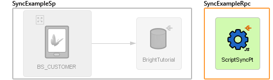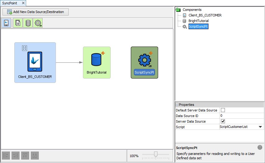 Once defined, the script may then be set up as a sync point on the server via the sync panel of a BEP BrightServer configuration project. This is done by dragging and dropping the script icon into the sync space, and naming the script via the 'Script' property. As RPCs are an online process, the sync point does not need to be associated with a client table, but it must be exposed as a data source to BrightServer for these online operations to occur.