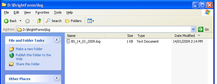 The log files are created in the log sub directory where BrightForms is installed, or the log sub directory in BrightForms' projects directory on iOS, Android and Modern Windows platforms. This directory normally does not exist and is only created by BrightForms when a new log files need to be created.