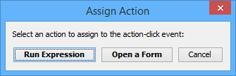 Controls which have not been assigned any actions may have these definitions automatically created via the Assign Action dialog. This dialog may be accessed by double clicking any control, which will then create and open either an expression or open form definition to be set to the control, based on the user selection.