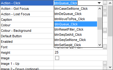 The image above is an example of BrightBuilder button properties, whose Action - Click, Action - Got Focus or Action - Lost Focus properties may be used to define an expression to run, or a form to open.