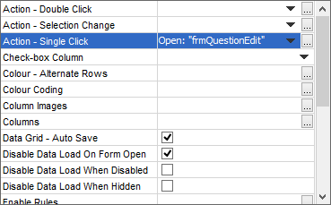 This image displays a button property list, the focused property is Action-Double Click which opens the "frmQuestionEdit" form.