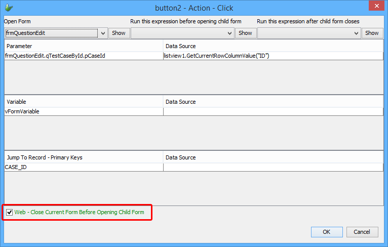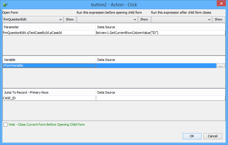 The 'Jump To Record - Primary Keys' values allows the user to open and display a specific child form query record within the form's Data Binding result set, based on the query and primary key values entered. For example, if 50 records are returned by a form's data binding query, the primary key values of a particular record may be assigned under this heading, such that the child form will open with particular record's position navigated or 'jumped' to. Form navigation may be used to traverse the query to other records, if available. The above image shows the 'CASE_ID' primary key in the child form populated by the parent's form's selection within its listview - lvCases. Like the variables of the child form, this is also optionally populated.