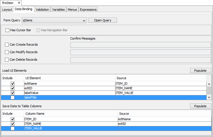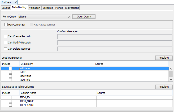 If the Save Data to Table Columns has already been filled-up, you can click the Populate button to automatically fill the Load table with the matching table columns based from the save table map. This feature is quite useful if your data binding is simple matching of table columns and form controls.