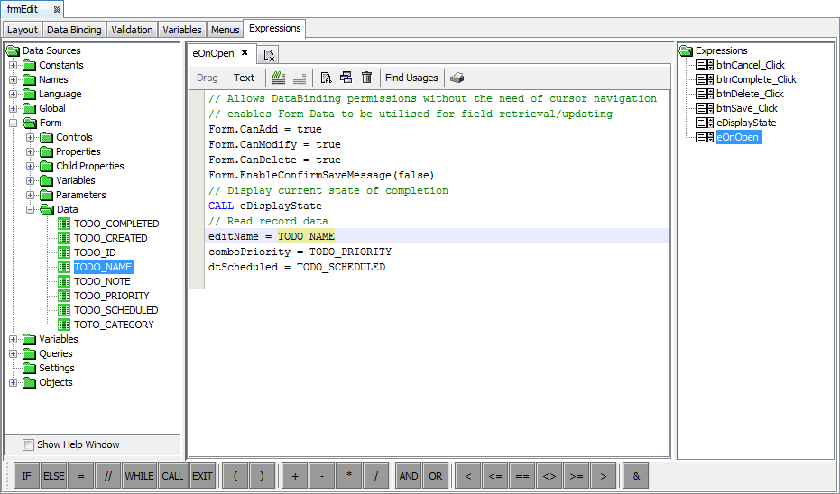 Finally, the behaviour of the form as a cursor form may be set via Form > Properties variables in the DST. Here, the form's ability to Create, Save and/or Delete records can all be changed in real time by assigning 'true' and 'false' to the CanCreate, CanModify and CanDelete values accordingly.