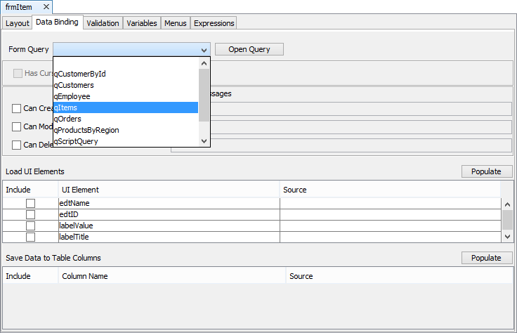 When creating the form layout, all the form controls that can accept user input, like edit controls and combo boxes, that have been added to the layout will automatically be included in the Load UI Elements section of the Data Binding tab.