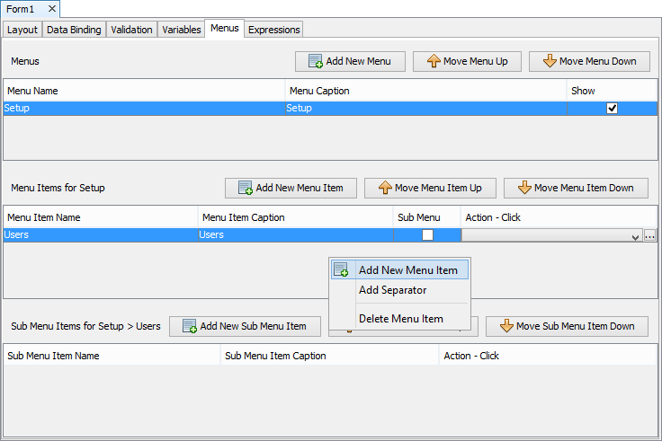 Each form may have a number of menus which appear on the toolbar of the client window. Each menu may have a number of menu items. Each menu item may invoke an action or it may be a sub menu, which in turn may have further sub menu items. Menus cannot be more than two levels deep.