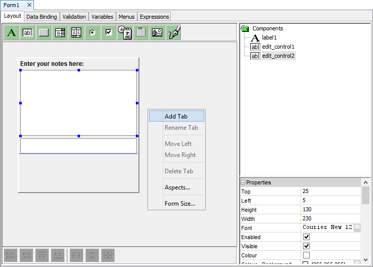 From this pop-up menu, tabs can be added, renamed, moved from left to right and deleted. Just always remember to right-click outside of the form layout.