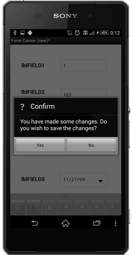 Once the project is run on BrightForms, whenever there are any changes made to the data bound controls, it is detected before the form is closed and a prompt will ask whether to save any of these changes, the following Save dialog will be displayed: