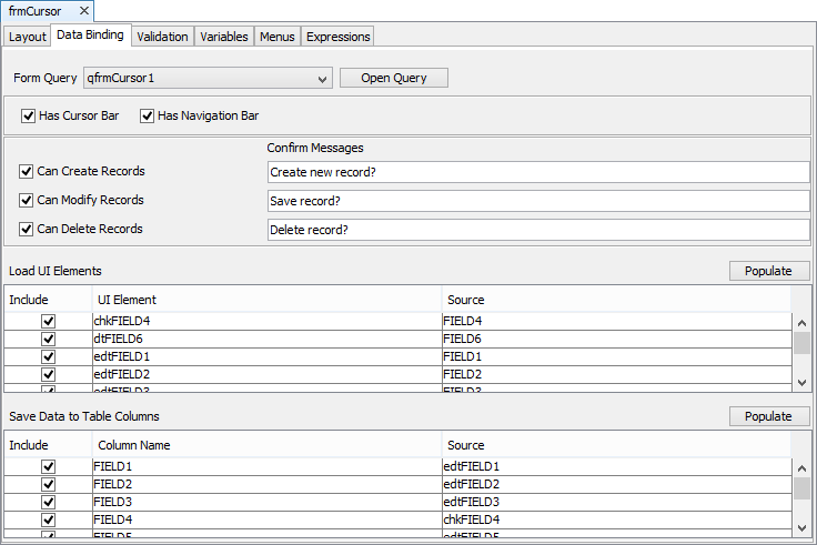 The following image is the form Data Binding tab, the cursor form can be created from here. Simply select the form query, cursor bar attributes, include columns and controls to the save and load section respectively.