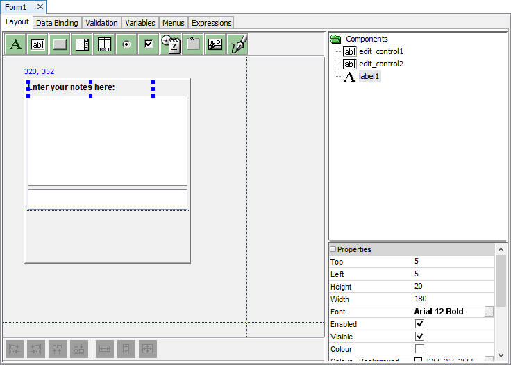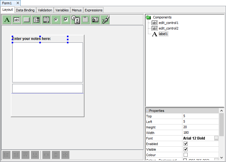 Like many applications, BrightBuilder uses the concept of variables to store data locally in the form. They can be used to accept data from the parent form or for temporarily storing data during the life cycle of the form. Each variable has a name that uniquely identifies it within the form and a data type must be specified when declaring a variable.