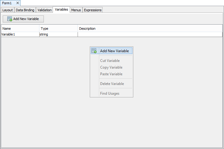 To add a new variable, simply right click on the Variables tab grid and a popup menu will appear.