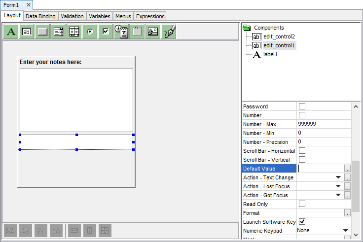 | Window Mobile - Has Scroll Bars | Instructs to show vertical and/or horizontal scroll bar if the form is bigger than the actual device size. This property is applicable to Windows Mobile platform. Ignored on other platforms. |