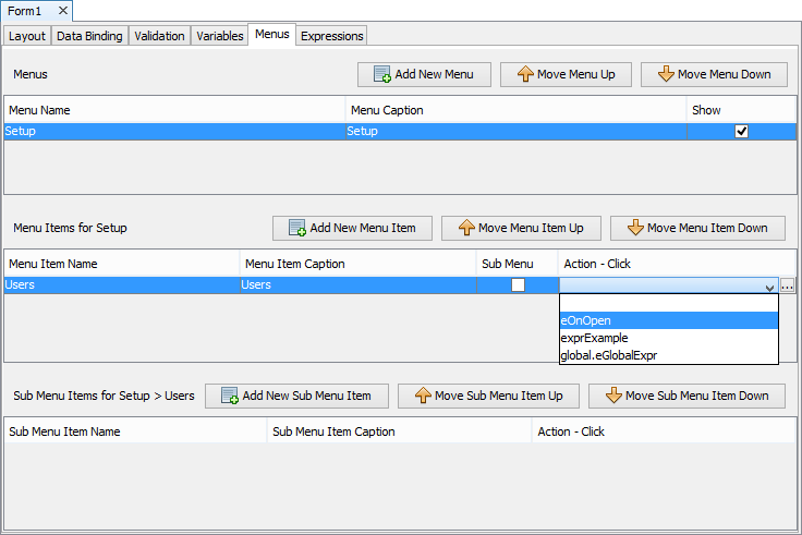 A menu item can either be a sub menus, call an expression or open a form. A sub menu item cannot be a sub menu but can call an expression or open a form.