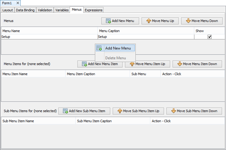 Menus can be created on the Globals panel and used in any form in the application. By default when a global menu has been created, it will be displayed in each form's menu list with its Show property un-ticked. Global menus are shown in grey and prefixed with the "global" key word.