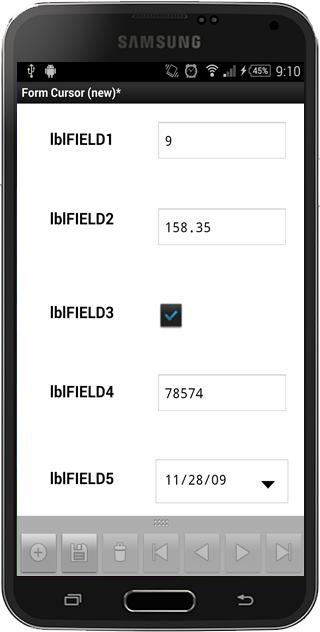 An example of a cursor form with many form controls is shown above. Note the cursor bar at the bottom which provides buttons to create new records, save records, delete records and navigate the record set.