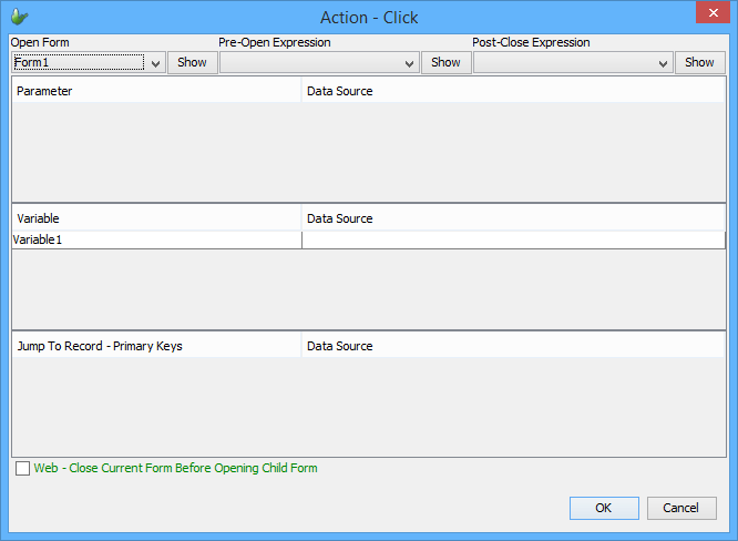 While data passing from child to parent form uses the Form/Result property. The child form sets the result property and the parent form may access the result using a Post-close expression. Read on to learn more on Forms.