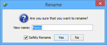 Or, use the popup menu when right-clicking the form name and select Rename, a Rename dialog box will appear. Enter the new form name in the New Name field and click Ok or press ENTER.