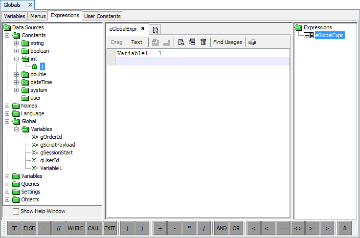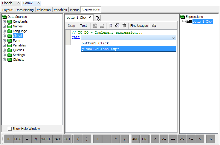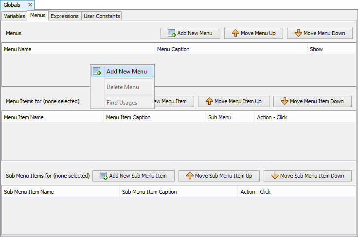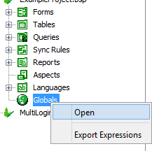 The Globals element allows you to create and define global variables, global expressions, user defined constants and global menus. These objects can be accessed and used by any form in the project.