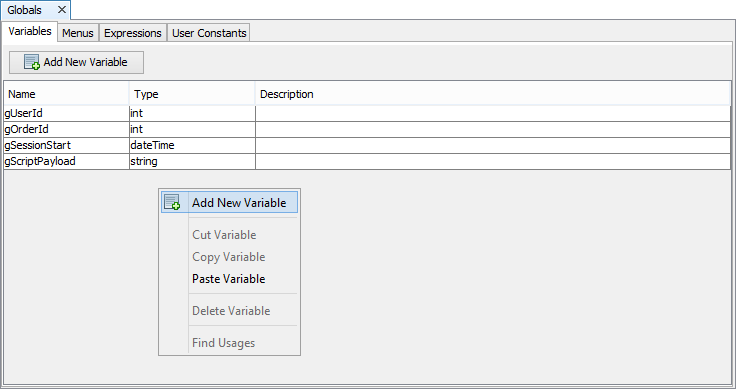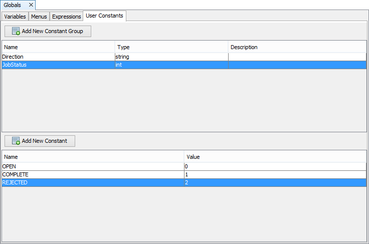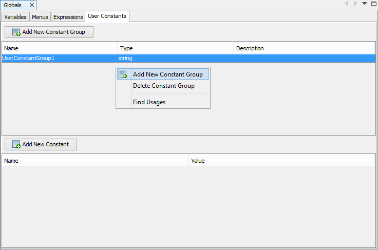 Double-click on the Globals element to open it in the Editor window, and select the User Constants tab.