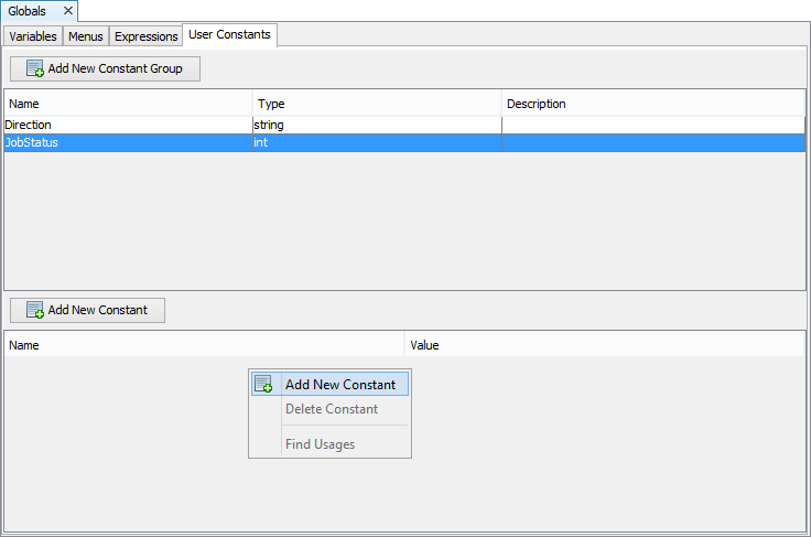 Tap on the 'Add New Constant' button, or select the context menu option from the Constants (lower) table. A new constant will be created called 'UserConstant1'.