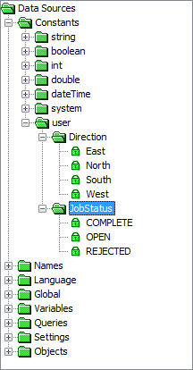 You can define a user constant through the Globals element. Accessing the user constants from the Data Source would be through Data Sources > Constants> user sub tree.