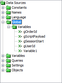 E.g. global.Variable1, global.VarTempString, global.IntID.