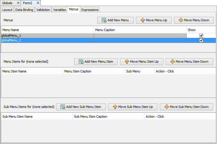 Global menus are menus which may be used on any form in the project. Each form has the option of displaying one or more global menus.