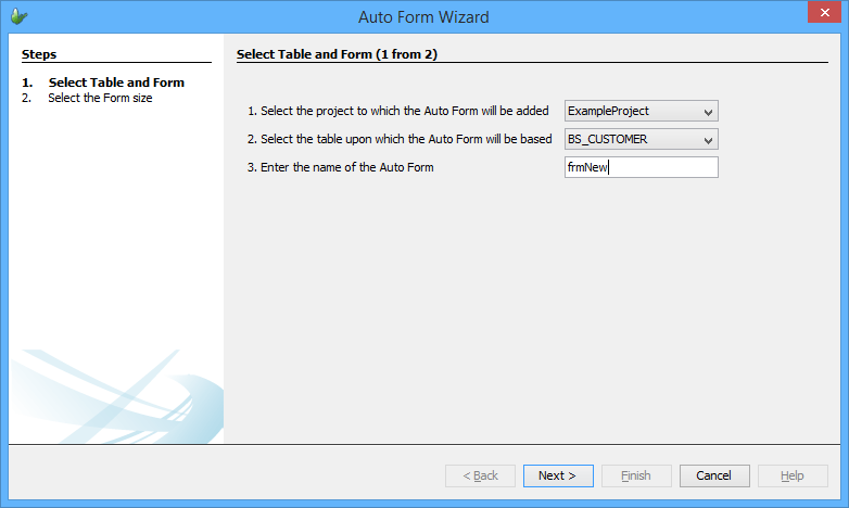 Auto Form functions as a wizard that allows a form and a sync rule to be automatically created based on a given table definition. This function can accessed via the Tools menu or the Table pop-up menu.