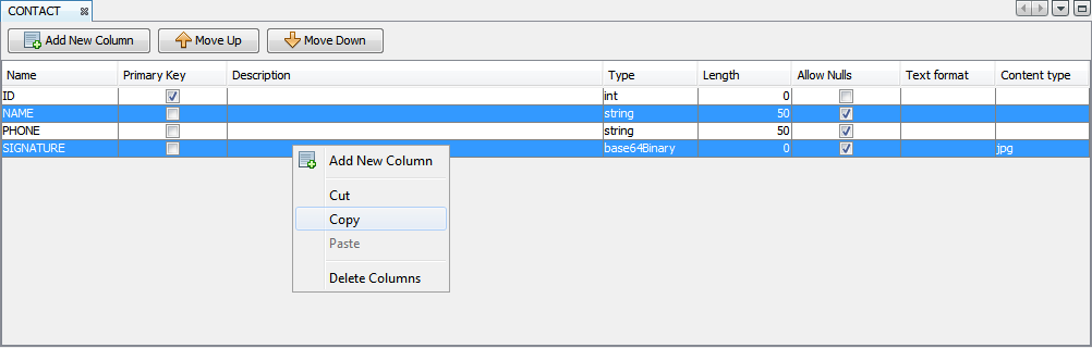 One or more fields may be copied and pasted and may be used to duplicate rows definitions within the same table, or use the same definitions in another. To access the copy and paste functions, select any number of rows and right click the selection. The options will be displayed in the context menu.