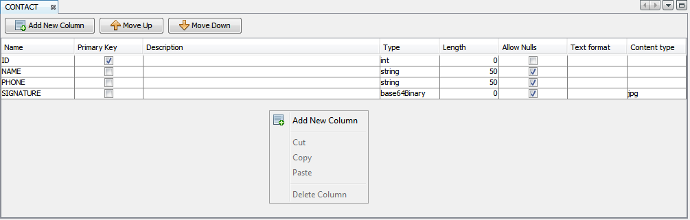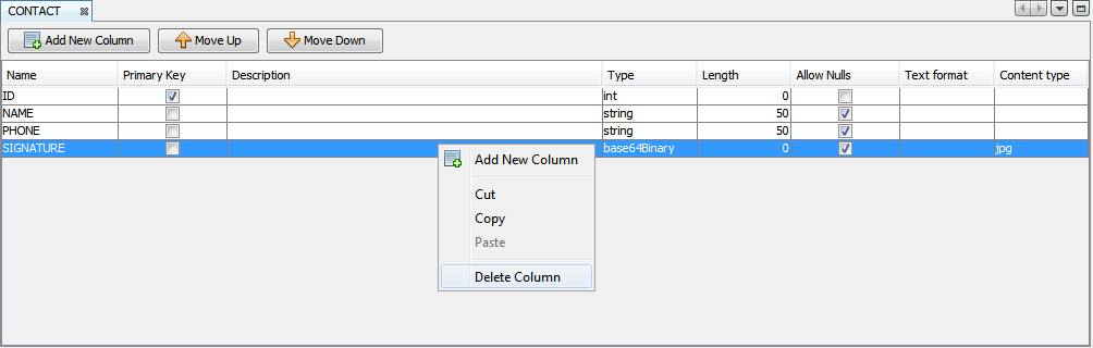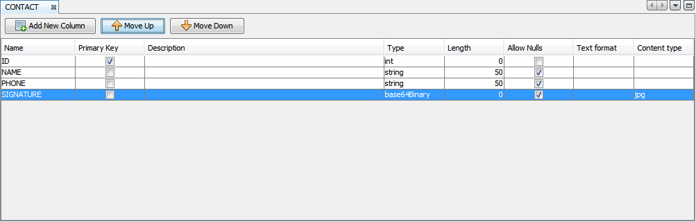 Content Type - is applicable only to binarybase64 columns and it specifies the file extension to be used when its content is written to a file. This field value is required only when using Database object's import, export and Dropbox related methods to import and export data to and from the table.